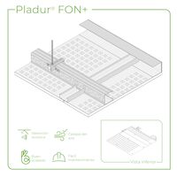 Techo suspendido formado por una doble estructura de perfiles de chapa de acero galvanizado, instalada al mismo nivel. La estructura primaria se compone a base de perfiles Pladur® NEO P-48/400, modulados cada 400 mm, debidamente suspendidos del forjado cada 1450 mm, por medio de pieza de cuelgue Pladur® NEO Regulable + varilla roscada ø 6 mm con tuerca y contratuerca y apoyados perimentralmente en perfiles Pladur® NEO CP-48/400, cuales están fijados mecánicamente en toda su longitud cada 400 mm. La estructura secundaria está formada por perfiles Pladur® NEO S-1200 ensamblados de manera perpendicular mediante unión «clipada» a los primarios en su alma troquelada y fijados perimetralmente a los perfiles Pladur® CP-48/400 mediante tornillos Pladur® MM. Perpendicularmente a la estructura primaria,se atornillan las placas de Pladur® FON+ BA (borde afinado) de 12,5 mm de espesor y de 1200x2400 mm, modelo variable, dependiendo de la absorción acústica requerida y del diseño de las perforaciones elegidas. Lana mineral de 60 mm de espesor, colocada sobre el dorso de placas y perfiles. Parte proporcional de anclajes, suspensiones, cuelgues, tornillería, juntas estancas/acústicas de su perímetro, cintas y pastas de juntas, etc. Totalmente terminado con Nivel 2 (Q2), Nivel 3 (Q3), Nivel 4 (Q4), según superficie de acabado (a definir en proyecto). Montaje según recomendaciones Pladur®, Technical Conformity TC-087066 y consideraciones específicas del CTE, según el uso del sistema empleado.