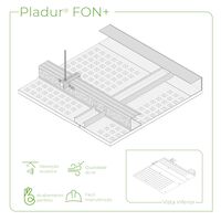 Teto suspenso formado por uma estrutura dupla de perfis de chapa de aço galvanizado, instalada ao mesmo nível. A estrutura primária é composta por perfis Pladur® NEO P-48/400, modulados a cada 1200 mm, devidamente suspensos da laje a cada 1450 mm, através de peças de apoio Pladur® NEO Ajustável + varão roscado ø 6 mm com porca e contraporca e apoiados perimetralmente em perfis Pladur® NEO CP-48/400, os quais estão fixados mecanicamente em todo o seu comprimento a cada 400 mm. A estrutura secundária é formada por perfis Pladur® NEO S-1200 montados perpendicularmente, através de uma união “grampeada” aos primários no recorte da alma do perfil, e fixados perimentralmente aos perfis Pladur® CP-48/400 com parafusos Pladur® MM. Perpendicularmente à estrutura primária, são aparafusadas as placas de Pladur® FON+ BA (borde afinado) de 12,5 mm de espessura e de 1200x2400 mm, modelo variável, dependendo da absorção acústica necessária e do design das perfurações escolhidas. Lã mineral com 60 mm de espessura, colocada na parte traseira da placa e sobre os perfis. Parte proporcional de fixações, suspensões, apoios, parafusos, juntas estanque/acústica no perímetro, fita e pasta de juntas, etc. Montagem de acordo com as recomendações técnicas Pladur®, Technical Conformity TC-087066 e considerações específicas do CTE, dependendo da utilização do sistema instalado.