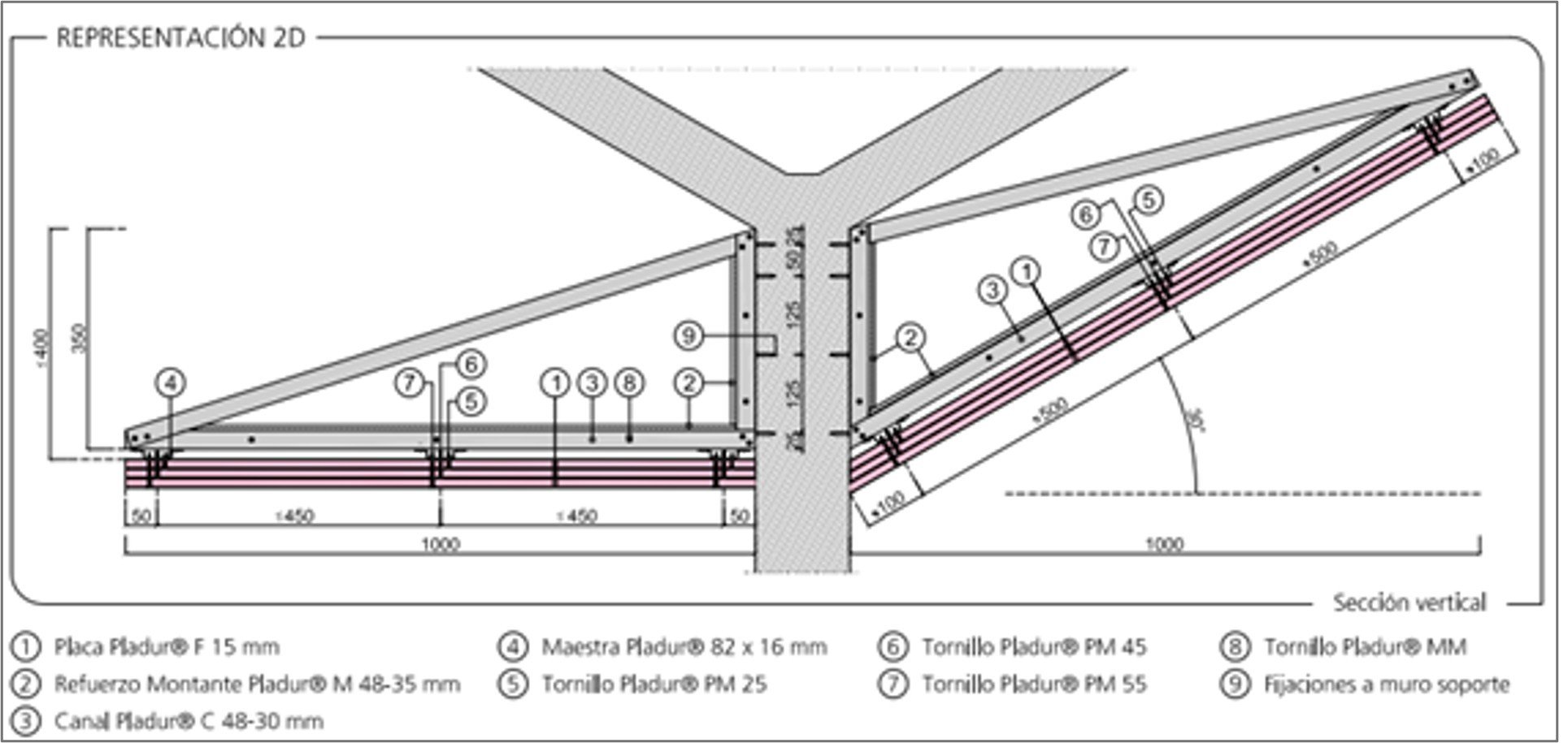 De esta manera, desde Pladur® indicamos que, para obtener una clasificación de resistencia al fuego EI60, EI90 o EI120, se deberá disponer una estructura de escuadras con ángulos comprendidos entre 0º y 45º, con maestras Pladur® a las que se atornillen las placas Pladur® F15 que determine el ensayo.