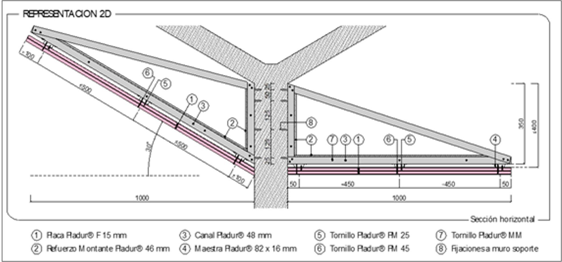 La franja perimetral está compuesta por un canal continuo, en el que se realizarán unos cortes para conformar la escuadra, y en el que se incluirán unos refuerzos de montante en los lados A y B (ver dibujo anterior). El lado A tendrá una longitud de 35 cm, lo que permitirá una correcta ejecución según exigencias del Real decreto, en el que se establece que: