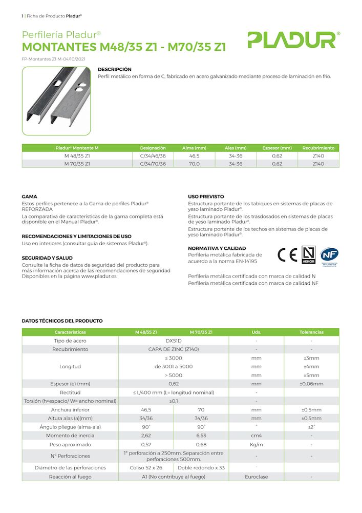 Ficha técnica Montante Gama Reforzada Pladur