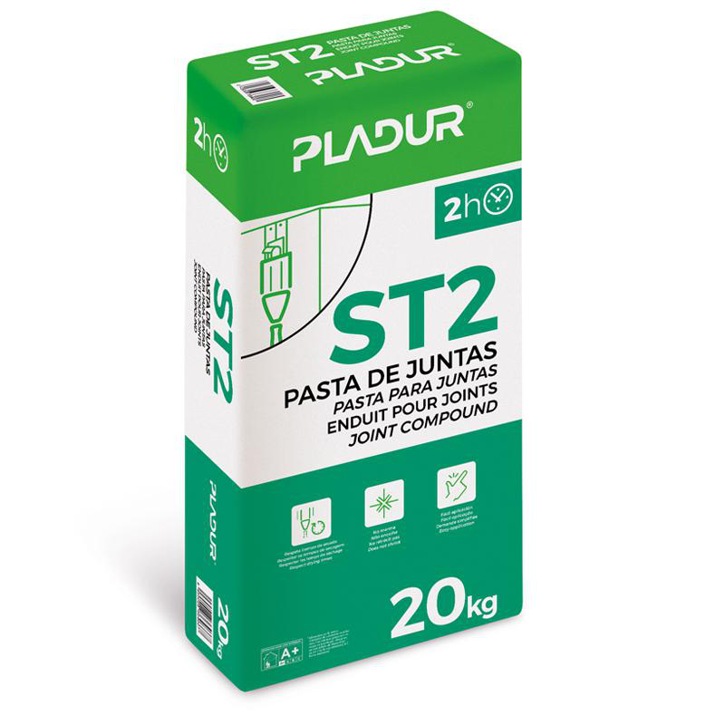 La pasta para juntas Pladur ST2 está indicada para realizar, en combinación con la Cinta para juntas Pladur, el tratamiento completo (relleno y terminación) de las juntas y el emplastecido de las cabezas de los tornillos en los sistemas de placa de yeso laminado Pladur, obteniendo una superficie plana y lisa, lista para llevar a cabo los trabajos de decoración. Permite realizar tratamientos de juntas en menos de una jornada. Puede emplearse para dar un repaso general a zonas que pudieras haber sufrido leves desperfectos durante el montaje o subsanar ligeras irregularidades en las placas. No se recomiendo su uso de forma mecánica. No es válida para realizar tratamientos de juntas sin cinta.