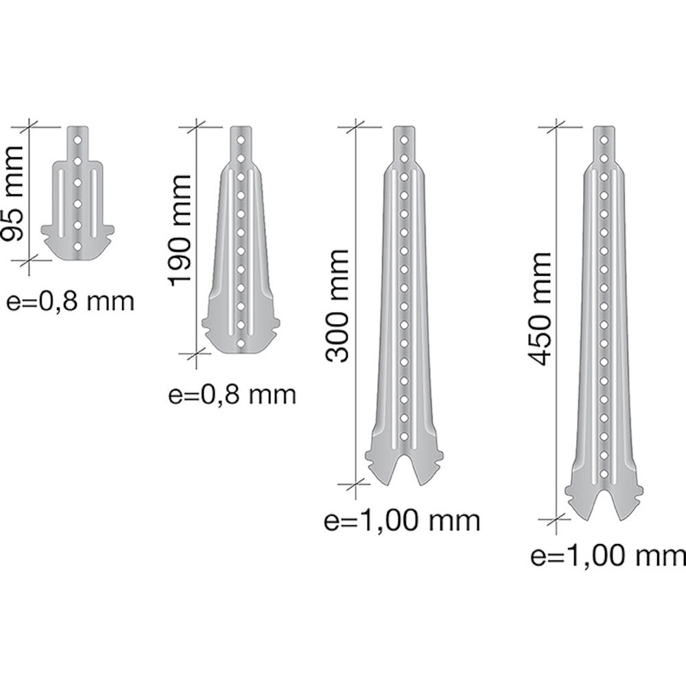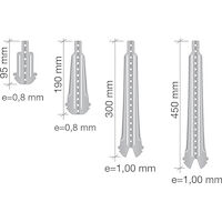Pieza plana de cuelgue, en diferentes longitudes, para atornillar a vigas de madera, extremo en forma de horquilla para encajer en perfil T-45.