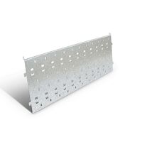 Panel de acero galvanizado sujeto a dos soportes entre los montantes del sistema Pladur. A este panel se pueden fijar mediante bridas o tornillos todo tipo de instalaciones. Mediante sus accesorios se adapta a las necesidades de altura y profundidad. De acero galvanizado 0,8 mm y en forma de U. Con multitud de perforaciones para la sujección de cajas de luz, tubos, cables...