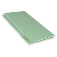 Placa de yeso laminado con alma de yeso natural y láminas de celulosa. Tipo I, H1 (EN 520:2004 +A1:2009), baja absorción de agua, alta dureza, resistencia al fuego. Espesor 18 mm, ancho 900 mm, color verde, bordes afinados.