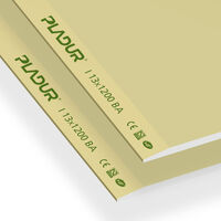 Placa de yeso laminado con alma de yeso natural y láminas de celulosa. Tipo I (EN-520:2004 +A1:2009), alta dureza. Espesor 12,5 mm, ancho 1200 mm, color mostaza, bordes afinados.