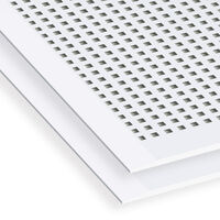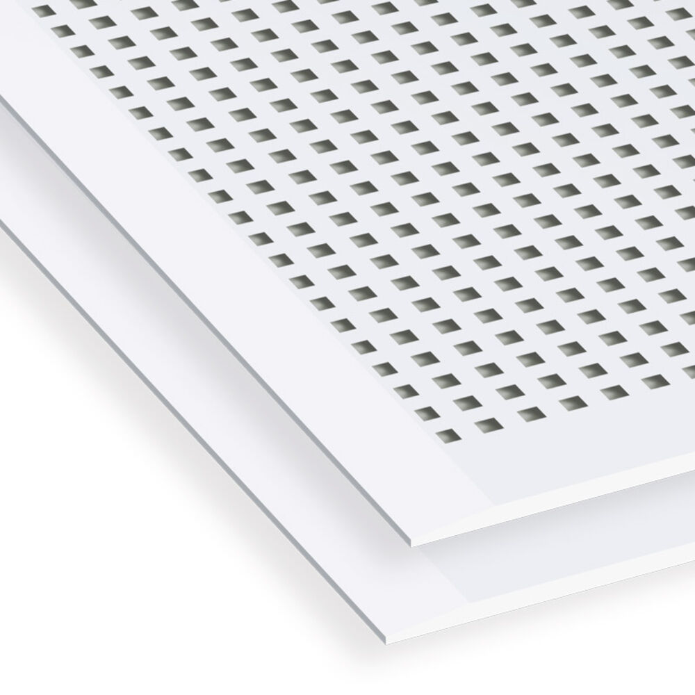 Placa de yeso laminado para techos, perforada con taladros cuadrados de 12 x 12 mm cada 25 mm. Tecnología Pladur® AIR, mejora la calidad del aire interior. Espesor 12,5 mm, ancho 1200 mm, longitud 2400 mm, bordes afinados.