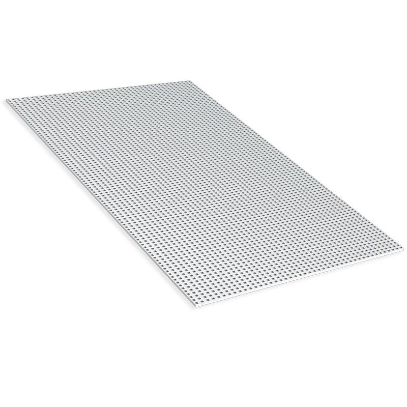 Placa de yeso laminado para techos, perforada con taladros cuadrados de 12 x 12 mm cada 25 mm. Tecnología Pladur® AIR, mejora la calidad del aire interior. Espesor 12,5 mm, ancho 1200 mm, longitud 2400 mm, bordes biselados.