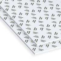 Placa de yeso laminado para techos, perforaciones lineales de 6x36 mm y 6x25 mm en disposición oblicua, patrón cada 10 cm. Tecnología Pladur® AIR, mejora la calidad del aire interior. Espesor 12,5 mm, ancho 1200 mm, longitud 2400 mm, bordes biselados.