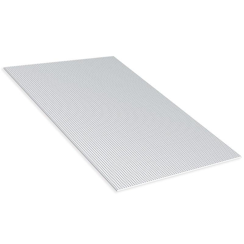 Placa de yeso laminado para techos, perforada con taladros redondos Ø 8 mm cada 18,75 mm. Tecnología Pladur® AIR, mejora la calidad del aire interior. Espesor 12,5 mm, ancho 1200 mm, longitud 2400 mm, bordes biselados.