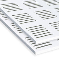 Placa de yeso laminado para techos registrables, perforada con taladro rectangular de 5 x 80 mm, acabado blanco. Tecnología Pladur® AIR, mejora la calidad del aire interior. Espesor 12,5 mm, dimensiones 600 x 600 mm.