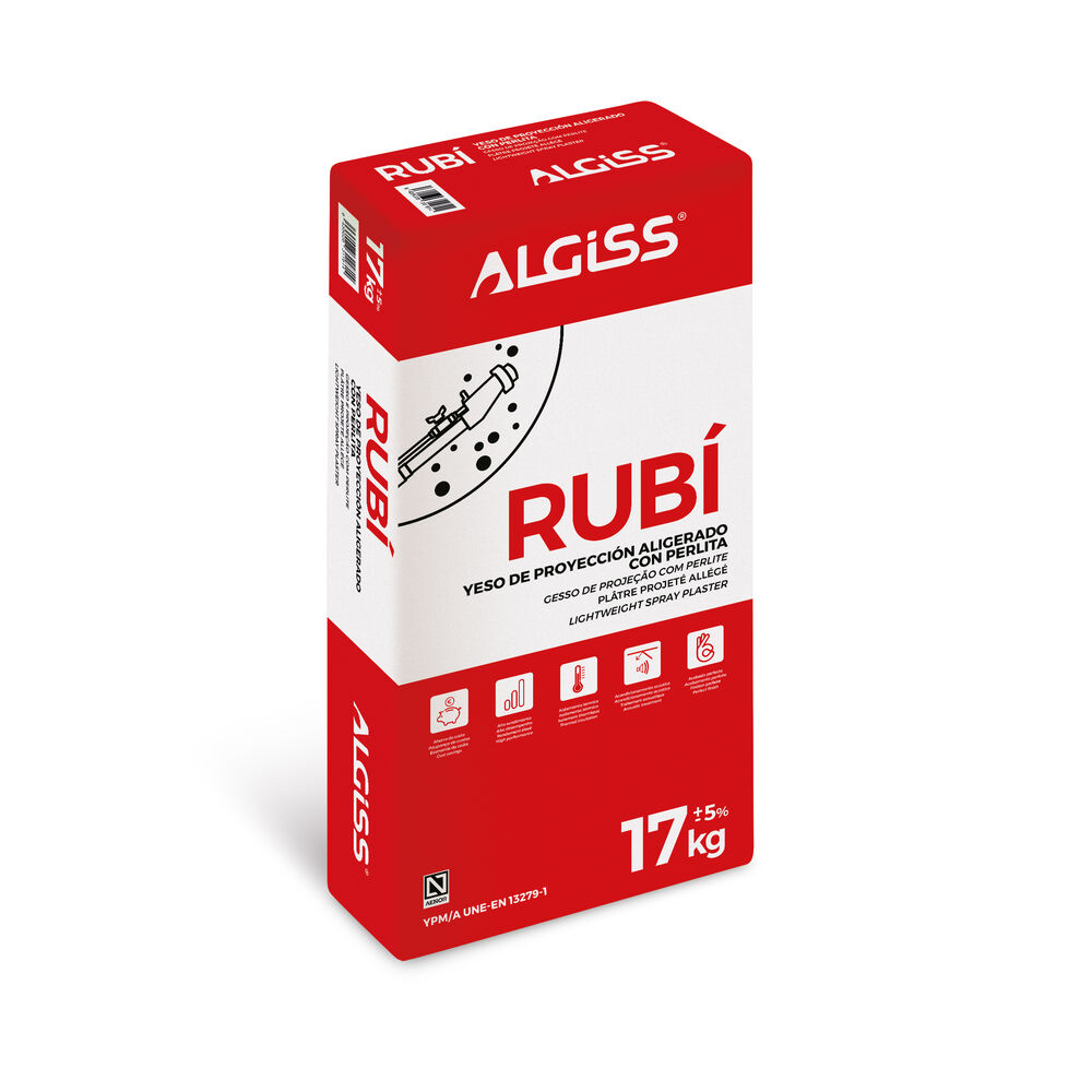 Yeso de proyección mecánica monocapa con perlita, alta dureza, propiedades térmicas y acústicas, buen comportamiento frente al fuego.