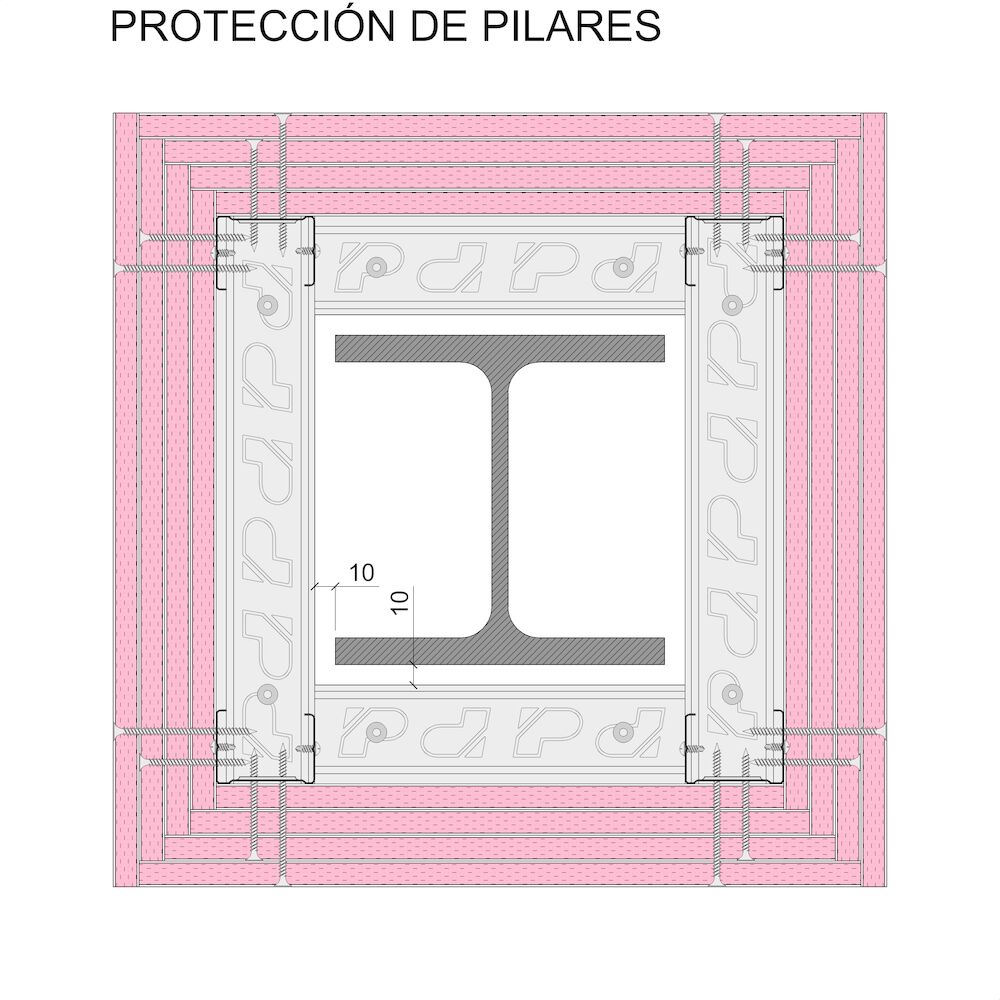 Protección de estructuras de acero mediante un sistema de Trasdosados autoportantes Pladur® formados por una estructura de perfiles metálicos de chapa de acero galvanizada de 48 mm de ancho, a base de Montantes (elementos verticales) de alas de 35 mm y separados entre sí 400 mm, y Canales (elementos horizontales) separados del perfil a proteger 10 mm mínimo. A esta estructura se atornillan cuatro placas Pladur® F de 12,5 mm de espesor, correspondiente a la protección indicada por la norma. Cada una de las capas de placa realizadas deben recibir el tratamiento de juntas completo. Parte proporcional de anclajes, tornillería, juntas estancas, cintas y pastas de juntas, etc., totalmente terminado, con una calidad de terminación de Q2. Montaje según recomendaciones Pladur®, norma UNE 102043 y CTE.
