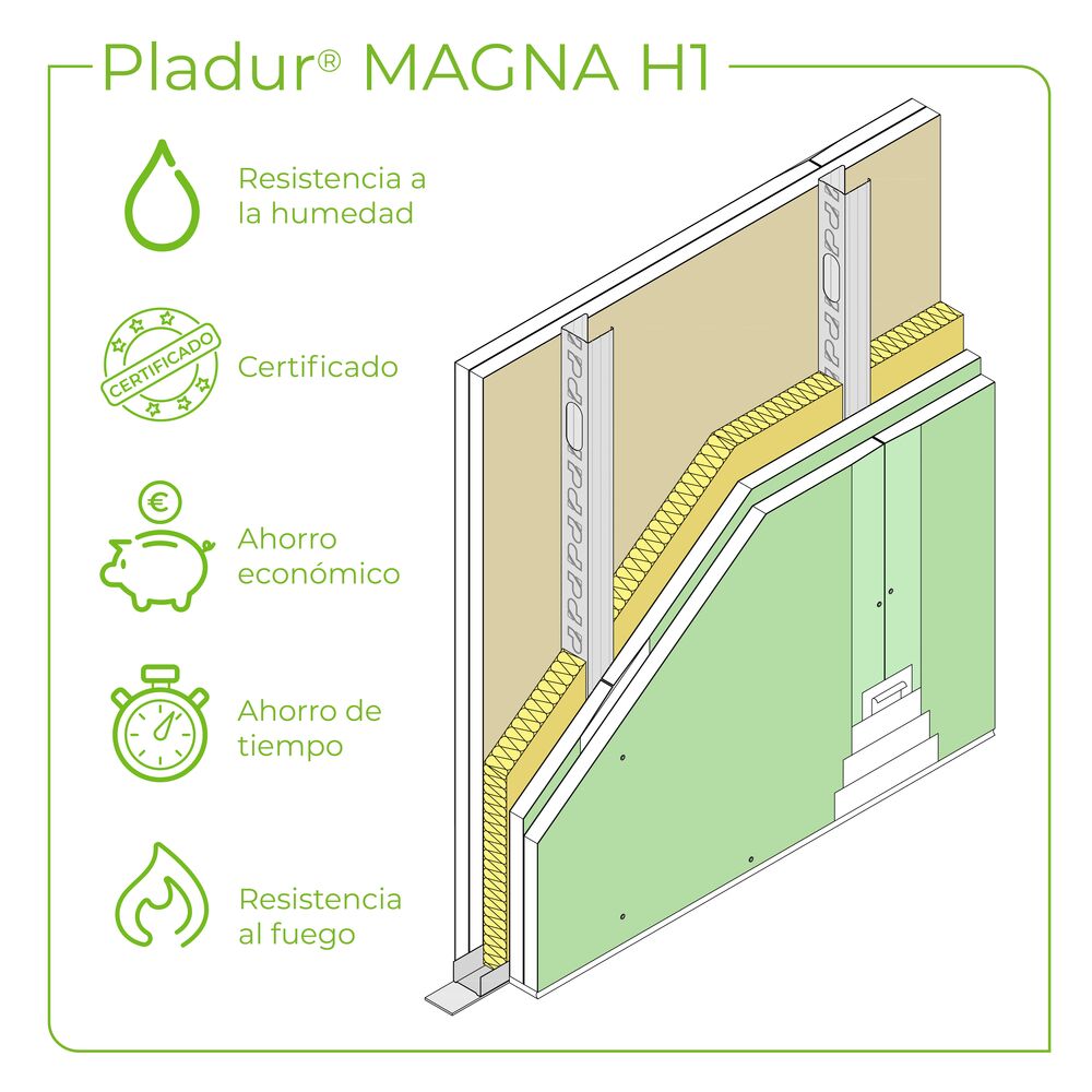Tabique formado por una placa Pladur® MAGNA H1 de 18 mm de espesor atornillada a cada lado de una estructura de de acero galvanizado de 62 mm de ancho, a base de montantes Pladur® XL (elementos verticales) de alas 45 mm, modulados a 900 o 450 mm, y canales Pladur® XL (elementos horizontales), dando un ancho total de tabique terminado de 98 mm.Parte proporcional de materiales Pladur®: tornillería, pastas, cintas de juntas, juntas estancas/acústicas de su perímetro, etc., así como anclajes para canales en suelo y techo. Totalmente terminado con Nivel de Acabado 1 (Q1) para terminaciones de alicatado, laminados, con rastreles, etc. También con Nivel 2 (Q2), Nivel 3 (Q3), Nivel 4 (Q4), según superficie de acabado (a definir en proyecto). Alma de la estructura Pladur® rellena en su totalidad con lana mineral de 60 a 70 mm de espesor. Montaje según recomendaciones técnicas Pladur®, DIT PLUS N.º 646p /20 y requisitos del CTE.