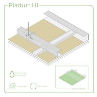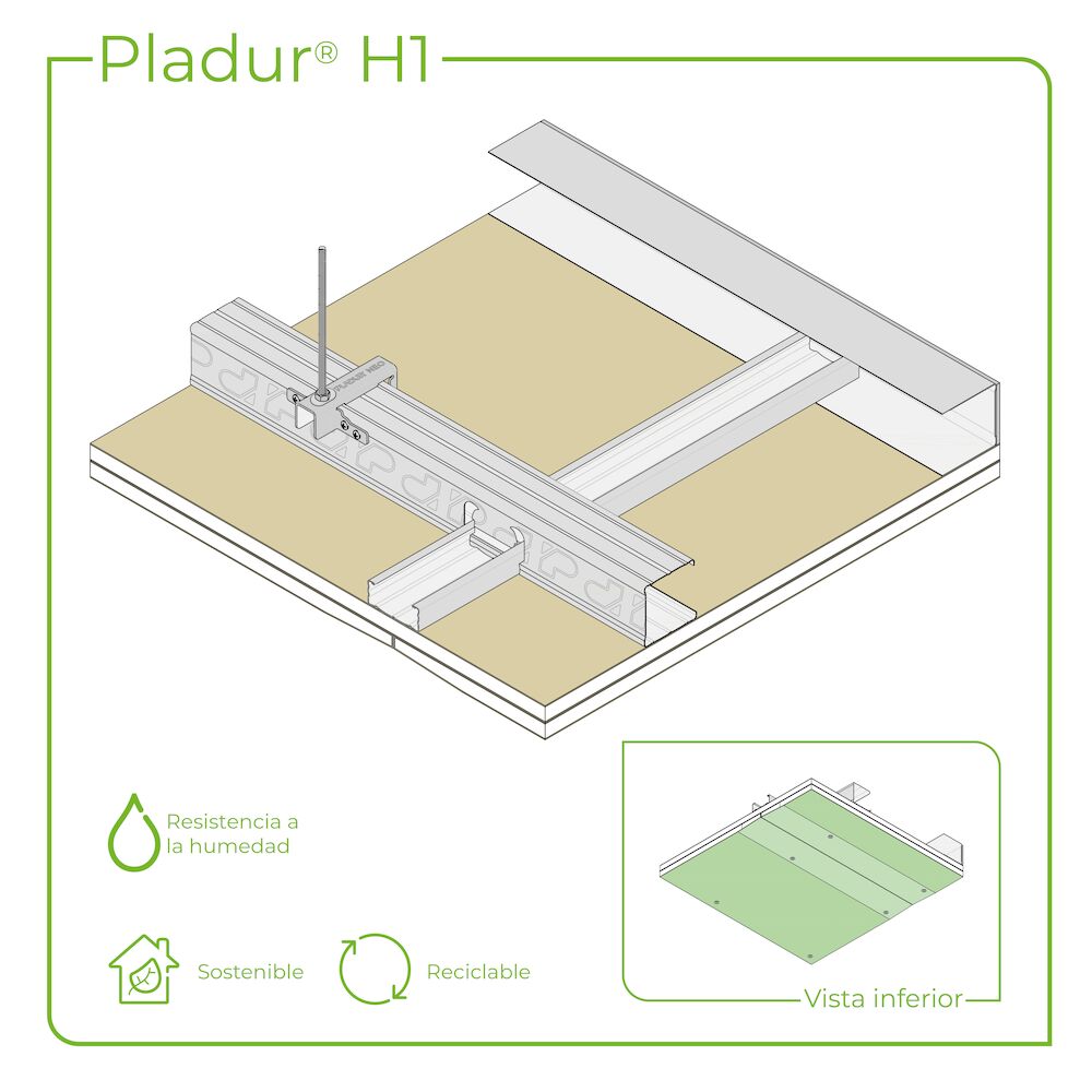 Techo suspendido formado por una doble estructura de perfiles de chapa de acero galvanizado, instalada al mismo nivel. La estructura primaria se compone a base de perfiles Pladur® NEO P-48/400, modulados cada 1000 mm, debidamente suspendidos del forjado cada 1500 mm, por medio de pieza de cuelgue Pladur® NEO Regulable + varilla roscada ø 6 mm con tuerca y contratuerca y apoyados perimetralmente en perfiles Pladur® NEO CP-48/400, cuales están fijados mecánicamente en toda su longitud cada 400 mm. La estructura secundaria está formada por perfiles Pladur® NEO S-1000 ensamblados de manera perpendicular mediante unión «clipada» a los primarios en su alma troquelada y fijados perimetralmente a los perfiles Pladur® CP-48/400 mediante tornillos Pladur® MM. Perpendicularmente a la estructura primaria, se atornillan dos placas Pladur® H1 de 12,5 mm de espesor. Parte proporcional de anclajes, suspensiones, cuelgues, tornillería, juntas estancas/acústicas de su perímetro, cintas y pastas de juntas, etc. Totalmente terminado con Nivel 2 (Q2), Nivel 3 (Q3), Nivel 4 (Q4), según superficie de acabado (a definir en proyecto). Montaje según recomendaciones Pladur®, Technical Conformity TC-087066 y consideraciones específicas del CTE, según el uso del sistema empleado.