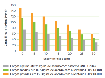 Em função dos pontos de fixação por metro linear e da altura (h) (medida desde o ponto de fixação até o ponto de apoio inferior da carga), pode-se averiguar o tipo de carga e o seu valor máximo de arrancamento, o que permite escolher o tipo de fixação adequado.