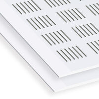 Placa de gesso laminado para tetos formada por uma alma de gesso 100% natural diretamente ligada a duas lâminas de celulose. A referida placa é perfurada com perfurações retangulares de 5 x 80 mm. Carateriza-se por ter uma espessura nominal de 13 mm e por possuir uma largura nominal de 1200 mm e uma longitude nominal de 2400 mm. Esta placa tem os bordos longitudinais, revestidos a cartão e configurados como Bordos Afinados (BA).