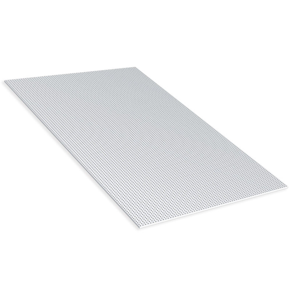 Placa de gesso laminado para tetos formada por uma alma de gesso 100% natural diretamente ligada a duas lâminas de celulose. A referida placa é perfurada com perfurações redondas Ø 8 mm cada 18,75 mm distribuídas uniformemente em toda a placa. Caracteriza-se por ter uma espessura nominal de 13 mm e por possuir uma largura nominal de 1200 mm e uma longitude nominal de 2400 mm. Esta placa tem os bordos transversais e longitudinaisbiselados (BV).