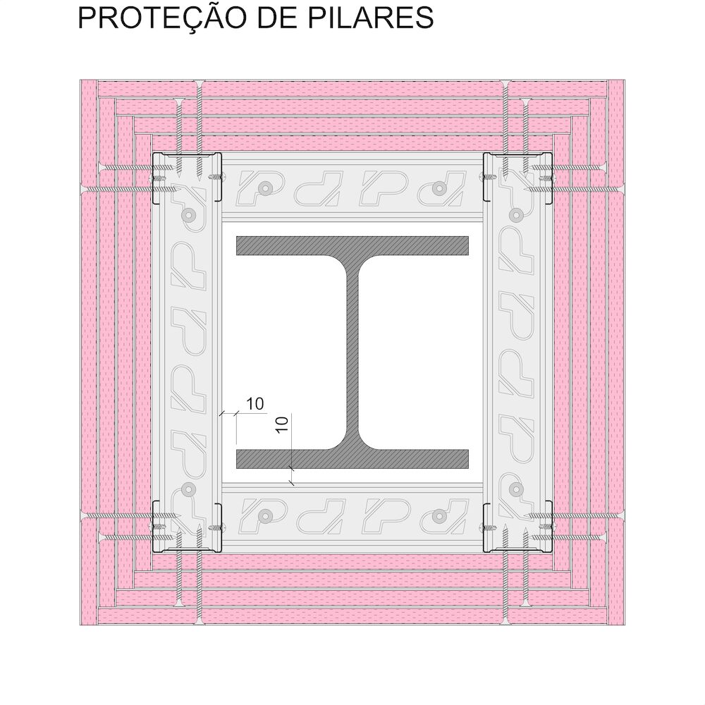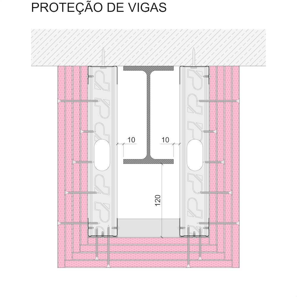 Proteção de estruturas de aço através de um sistema de Revestimentos autoportantes Pladur®, formados por uma estrutura de perfis metálicos de chapa de aço galvanizada de 46 mm. As bases dos Montantes devem distar entre si uma largura mínima de 400 mm e os Canais (elementos horizontais), separados 10 mm, no mínimo, do perfil a proteger. A esta estrutura aaparafusam-se quatro Placas Pladur® F de 12,5 mm de espessura, correspondente à proteção indicada pela norma. Cada placa colocada deverá ainda receber o tratamento de juntas completo. Parte proporcional de ancoragens, parafusos, juntas estanques, cintas e pastas de juntas, etc., totalmente terminado, com uma qualidade de acabamento Q2. Montagem segundo recomendações Pladur®, norma UNE 102043 e CTE.
