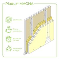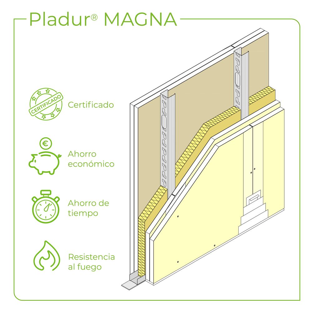 Tabique formado por uma placa Pladur® MAGNA de 25 mm de espessura aparafusada a cada lado de uma estrutura de aço galvanizado de 70 mm de largura, composta por montantes Pladur® (elementos verticais) de abas 35 mm, modulados a 450 mm, e canais Pladur® (elementos horizontais), dando uma largura total de tabique terminado de 120 mm. Parte proporcional de materiais Pladur®: parafusos, pastas, fitas de juntas, juntas estanques /acústicas no seu perímetro, etc., assim como fixações para canais ao chão e ao teto. Totalmente acabado com Nível de Qualidade de Acabamento 1 (Q1) para acabamentos de cerâmica, laminados, etc. Também com Nível 2 (Q2), Nível 3 (Q3), Nível 4 (Q4), de acordo com a superfície de acabamento (a definir em projeto). Alma da estrutura Pladur® preenchida na sua totalidade com lã mineral de 60 a 70 mm de espessura. Montagem de acordo com as recomendações técnicas Pladur® e DIT PLUS N.º 646p /20.