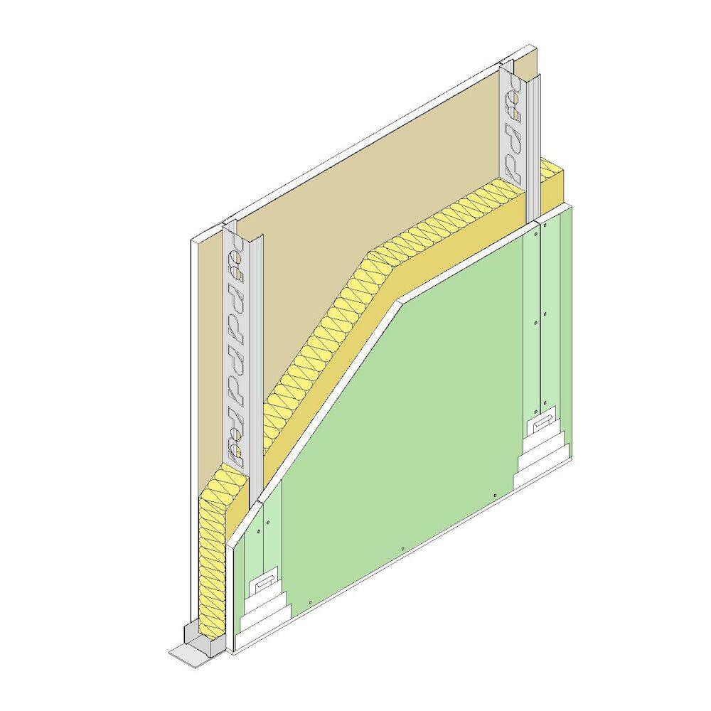 Tabique formado por uma placa Pladur® MAGNA H1 de 18 mm de espessura aparafusada a cada lado de uma estrutura de aço galvanizado de 100 mm de largura, composta por montantes Pladur® XL (elementos verticais) de abas 45 mm, modulados a 900 ou 450 mm, e canais Pladur® XL (elementos horizontais), dando uma largura total de tabique terminado de 136 mm. Parte proporcional de materiais Pladur®: parafusos, pastas, fitas de juntas, juntas estanques /acústicas no seu perímetro, etc., assim como fixações para canais ao chão e ao teto. Totalmente acabado com Nível de Qualidade de Acabamento 1 (Q1) para acabamentos de cerâmica, laminados, etc. Também com Nível 2 (Q2), Nível 3 (Q3), Nível 4 (Q4), de acordo com a superfície de acabamento (a definir em projeto). Alma da estrutura Pladur® preenchida na sua totalidade com lã mineral de 90 a 100 mm de espessura. Montagem de acordo com as recomendações técnicas Pladur® e DIT PLUS N.º 646p /20.