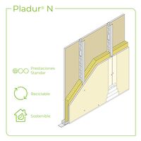 Tabique formado por uma placa Pladur® N de 15 mm de espessura, aparafuda a cada lado de uma estrutura de aço galvanizado de 90 mm de largura, composta por montantes Pladur® XL (elementos verticais) de abas de 45 mm e canais Pladur® XL (elementos horizontais), dando uma largura total de tabique terminado de 120 mm. Parte proporcional de materiais Pladur®: parafusos, pastas, fitas de juntas, juntas estanques /acústicas no seu perímetro, etc., assim como fixações para canais ao chão e ao teto. Totalmente acabado com Nível de Qualidade de Acabamento 1 (Q1) para acabamentos de cerâmica, laminados, etc. Também com Nível 2 (Q2), Nível 3 (Q3), Nível 4 (Q4), de acordo com a superfície de acabamento (a definir em projeto). Alma da estrutura Pladur® preenchida na sua totalidade com lã mineral de 80 a 90 mm de espessura. Montagem de acordo com as recomendações técnicas Pladur® e norma UNE 102043.
