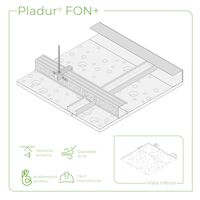 Teto suspenso formado por uma estrutura dupla de perfis de chapa de aço galvanizado, instalada ao mesmo nível. A estrutura primária é composta por perfis Pladur® NEO P-48/400, modulados a cada 1200 mm, devidamente suspensos da laje a cada 1450 mm, através de peças de apoio Pladur® NEO Ajustável + varão roscado ø 6 mm com porca e contraporca e apoiados perimetralmente em perfis Pladur® NEO CP-48/400, os quais estão fixados mecanicamente em todo o seu comprimento a cada 400 mm. A estrutura secundária é formada por perfis Pladur® NEO S-1200 montados perpendicularmente, através de uma união “grampeada” aos primários no recorte da alma do perfil, e fixados perimentralmente aos perfis Pladur® CP-48/400 com parafusos Pladur® MM. Perpendicularmente à estrutura primária, são aparafusadas as placas de Pladur® FON+ BV (borde em «V») de 12,5 mm de espessura e de 1200x2400 mm, modelo variável, dependendo da absorção acústica necessária e do design das perfurações escolhidas. Lã mineral com 60 mm de espessura, colocada na parte traseira da placa e sobre os perfis. Parte proporcional de fixações, suspensões, apoios, parafusos, juntas estanque/acústica no perímetro, fita e pasta de juntas, etc. Montagem de acordo com as recomendações técnicas Pladur®, Technical Conformity TC-087066 e considerações específicas do CTE, dependendo da utilização do sistema instalado.