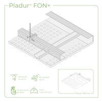 Teto suspenso formado por uma estrutura dupla de perfis de chapa de aço galvanizado, instalada ao mesmo nível. A estrutura primária é composta por perfis Pladur® NEO P-48/400, modulados a cada 1200 mm, devidamente suspensos da laje a cada 1450 mm, através de peças de apoio Pladur® NEO Ajustável + varão roscado ø 6 mm com porca e contraporca e apoiados perimetralmente em perfis Pladur® NEO CP-48/400, os quais estão fixados mecanicamente em todo o seu comprimento a cada 400 mm. A estrutura secundária é formada por perfis Pladur® NEO S-1200 montados perpendicularmente, através de uma união “grampeada” aos primários no recorte da alma do perfil, e fixados perimentralmente aos perfis Pladur® CP-48/400 com parafusos Pladur® MM. Perpendicularmente à estrutura primária, são aparafusadas as placas de Pladur® FON+ BA (borde afinado) de 12,5 mm de espessura e de 1200x2400 mm, modelo variável, dependendo da absorção acústica necessária e do design das perfurações escolhidas. Lã mineral com 60 mm de espessura, colocada na parte traseira da placa e sobre os perfis. Parte proporcional de fixações, suspensões, apoios, parafusos, juntas estanque/acústica no perímetro, fita e pasta de juntas, etc. Montagem de acordo com as recomendações técnicas Pladur®, Technical Conformity TC-087066 e considerações específicas do CTE, dependendo da utilização do sistema instalado.