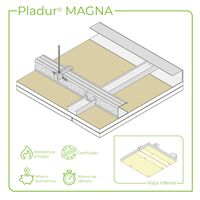 Teto suspenso formado por uma estrutura dupla de perfis de chapa de aço galvanizado, instalada ao mesmo nível. A estrutura primária é composta por perfis Pladur® NEO P-48/450, modulados a cada 1000 mm, devidamente suspensos da laje a cada 1200 mm,através de peças de apoio Pladur® NEO Ajustável + varão roscado ø 6 mm com porca e contraporca e apoiados perimetralmente em perfis Pladur® NEO CP-48/450, os quais estão fixados mecanicamente em todo o seu comprimento a cada 300 mm. A estrutura secundária é formada por perfis Pladur® NEO S-1000 montados perpendicularmente, através de uma união “grampeada” aos primários no recorte da alma do perfil, e fixados perimentralmente aos perfis Pladur® CP-48/450 com parafusos Pladur® MM. Perpendicularmente à estrutura primária, são aparafusadas duas placas Pladur® MAGNA de 25 mm de espessura. Parte proporcional de fixações, suspensões, apoios, parafusos, juntas estanque/acústica no perímetro, fita e pasta de juntas, etc. Totalmente acabado com Nível 2 (Q2), Nível 3 (Q3) ou Nível 4 (Q4) de acordo com a superfície de acabamento (a definir em projeto). Incluindo lã de vidro sobre o dorso das placas e perfis. Montagem de acordo com as recomendações técnicas Pladur®, Technical Conformity TC-087066 e considerações específicas do CTE, dependendo da utilização do sistema instalado.