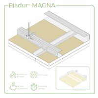 Teto suspenso formado por uma estrutura dupla de perfis de chapa de aço galvanizado, instalada ao mesmo nível. A estrutura primária é composta por perfis Pladur® NEO P-48/450, modulados a cada 1000 mm, devidamente suspensos da laje a cada 1300 mm,através de peças de apoio Pladur® NEO Ajustável + varão roscado ø 6 mm com porca e contraporca e apoiados perimetralmente em perfis Pladur® NEO CP-48/450, os quais estão fixados mecanicamente em todo o seu comprimento a cada 300 mm. A estrutura secundária é formada por perfis Pladur® NEO S-1000 montados perpendicularmente, através de uma união “grampeada” aos primários no recorte da alma do perfil, e fixados perimentralmente aos perfis Pladur® CP-48/450 com parafusos Pladur® MM. Perpendicularmente à estrutura primária, são aparafusadas duas placas Pladur® MAGNA de 18 mm de espessura. Parte proporcional de fixações, suspensões, apoios, parafusos, juntas estanque/acústica no perímetro, fita e pasta de juntas, etc. Totalmente acabado com Nível 2 (Q2), Nível 3 (Q3) ou Nível 4 (Q4) de acordo com a superfície de acabamento (a definir em projeto). Montagem de acordo com as recomendações técnicas Pladur®, Technical Conformity TC-087066 e considerações específicas do CTE, dependendo da utilização do sistema instalado.