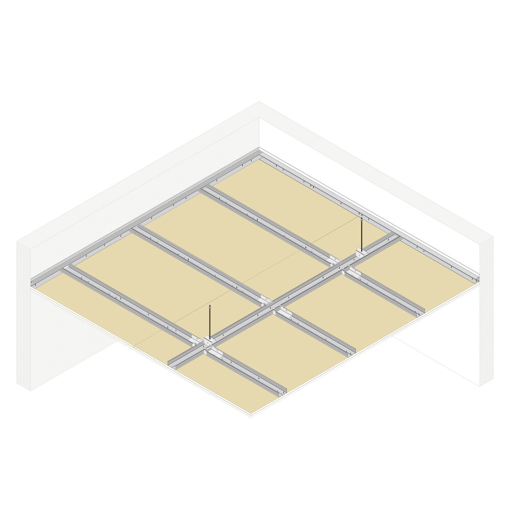 Tetos suspensos contínuos para divisões interiores com boas prestações de isolamento acústico e de resistência ao fogo. Contribui com uma maior consistência ao dispor-se de uma dupla estrutura disposta em sentido transversal entre si ao mesmo nível que permite realizar um maior aparafusamento da placa.
